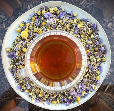 Organic Ingredients: Egyptian Blue Lotus, Chamomile, Butterfly Pea Flower, Gotu Kola, Cinnamon, Rooibos, Elderflower, Ginger, Rose, Vanilla